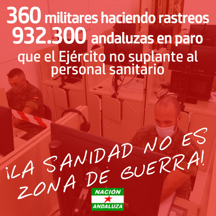 Nación Andaluza denuncia la introducción de 360 militares en las labores de rastreo del coronavirus mientras hay más de 930.000 andaluzas en paro. Nación Andaluza entiende que la Junta (PP-C’s-Vox) ni quiere, ni puede hacer una gestión eficaz y soberana de la salud de las andaluzas pero fomenta la penetración del Ejercito en la vida de las andaluzas para hacer más fácil de implementar la deriva autoritaria del Estado español.