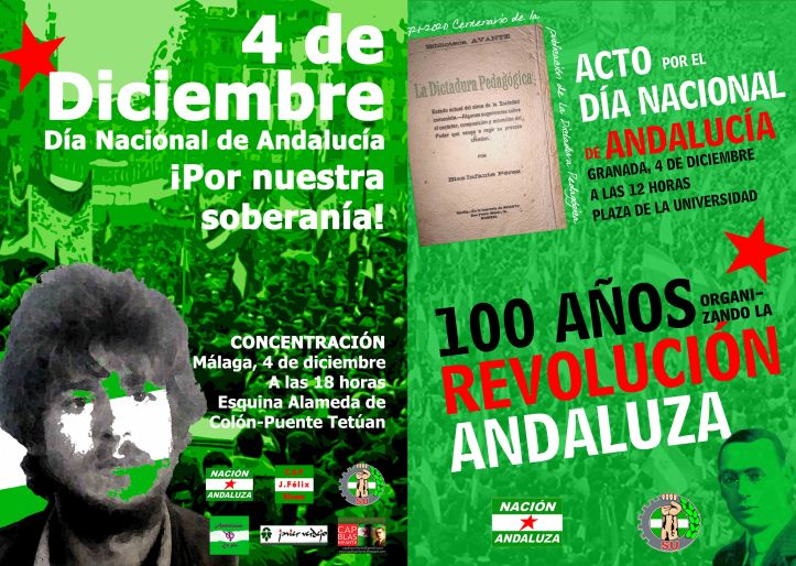 Por todo ello llamamos a nuestra militancia, adheridas y simpatizantes a participar en las dos movilizaciones que por este 4D que organiza Nación Andaluza junto con otros colectivos. La primera por la mañana en Granada para conmemorar el centenario de la publicación de la obra de Blas Infante “La Dictadura Pedagógica”, texto fundamental para comprender el andalucismo revolucionario de Blas Infante. La segunda por la tarde en Málaga, en la esquina en la que mataron a Manuel José García Caparrós, para recordar con él a todas las andaluzas y andaluces que han caído en la defensa de una Andalucía libre para la clase obrera.