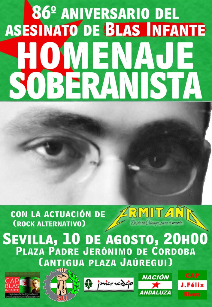 Este año conmemoramos el 86º aniversario del asesinato de Blas Infante en un nuevo homenaje soberanista a Blas Infante con la actuación musical del grupo de rock alternativo Ermitaño. Será el martes 10 de agosto a las 20 horas en la Plaza Padre Jerónimo de Córdoba de Sevilla. El acto está organizado por el Sindicato Unitario de Andalucía, los Centros Andaluces del Pueblo y Nación Andaluza.