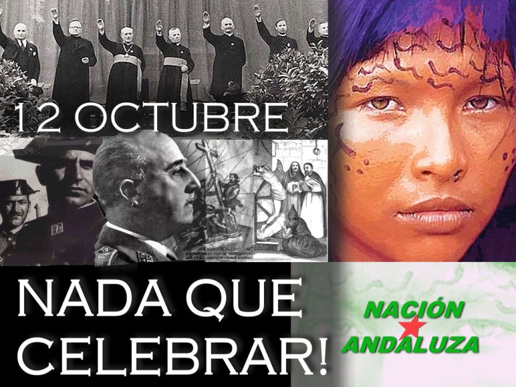 Esta fecha celebra el Estado español su pretendido pasado (en realidad el del Imperio castellano), el dominio sobre numerosos pueblos y la imposición cultural, lingüística, religiosa, política e histórica. Desde Andalucía denunciamos esta celebración por ser uno de los pueblos damnificados por este brutal imperialismo. Y en nuestro caso porque, a diferencia de los pueblos americanos, aún no hemos podido liberarnos de este yugo que nos somete desde hace más de 500 años. No en vano, la conquista de Andalucía fue el prólogo de la conquista de América; se usaron los mismos métodos de conquista y de asimilación justificados bajo el argumento religioso.