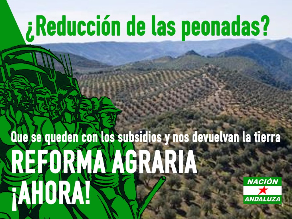 2º Este sistema tiene sus raíces en la concentración de la propiedad agraria en pocas manos en Andalucía. Un proceso que arranca de nuestra conquista por parte de la corona castellana y que ningún gobierno del Estado español posterior ha tenido interés en solucionar defendiendo los intereses nobiliario-burgueses. Contra la necesidad de la Reforma Agraria, el régimen del 78 ingenió el sistema Subsidio Agrario/Renta Agraria/Planes de Empleo Rural que mantiene a la clase obrera andaluza disponible para la burguesía agraria en el campo y para otros empleos de carácter temporal especulativo que son propios del capitalismo dependiente y colonial instalado en Andalucía (hostelería y construcción). Desde Nación Andaluza coincidimos con Blas Infante cuando afirmaba que «todo latifundio andaluz es ilegal en su origen». La actual estructura de la propiedad agraria es fruto de la conquista medieval de nuestro país y la administración castellano-española del mismo desde el medievo. La estructura de la propiedad agraria es ilegítima en buena parte y evidencia como la liberación social y nacional de Andalucía están intrínsecamente unidas.