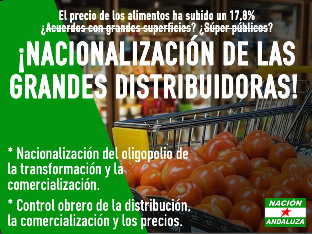 6ª Es necesaria la nacionalización de las grandes empresas transformadoras y comercializadoras para asumir los procesos de distribución y comercialización de la producción alimentaria, poniéndolas bajo la gestión y el control popular. Una nacionalización que ha de hacerse conquistando nuestra soberanía política en forma de República Andaluza de Trabajadoras para bajo control obrero establecer la planificación de la economía y los precios, así como la reindustrialización del país andaluz.