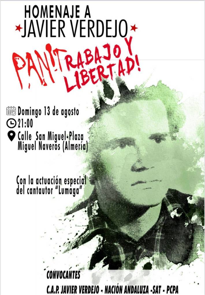 El régimen españolista y capitalista que mató a Javier es el mismo que hoy nos explota y domina. Y para Andalucía no puede ser de otra manera, seguirá siempre así, mientras no alcancemos el poder político para desprendernos de dicho dominio, es decir mientras Andalucía no sea libre e independiente. Por ello no vamos a perder el tiempo en pedirle a este gobierno español, ni a otros que puedan venir, que pidan perdón por el crimen de Javier y de muchos otros, ni les vamos a pedir que les pongan una placa, ni una calle, ni ninguna mención institucional. El homenaje y recuerdo a Javier Verdejo no puede venir de las instituciones, ni por supuesto de aquellas organizaciones políticas que fueron y son parte del Sistema. La obligación de honrarlo y reivindicarlo es nuestra, de la clase trabajadora andaluza, de las militantes revolucionarias, de las personas y organizaciones honestas y comprometidas en cambiar de raíz este mundo. El domingo, día 13 de agosto a las 9 de la noche en Almería, en el mismo lugar donde lo mataron, tenemos una cita ineludible.